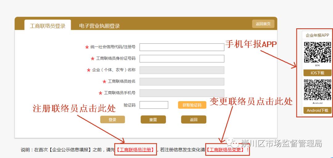 注意:該圖右邊有兩個(gè)年報(bào)APP二維碼,用于手機(jī)申報(bào)年報(bào)。一個(gè)是IOS系統(tǒng),適用于蘋(píng)果手機(jī),用微信掃碼。一個(gè)是Android系統(tǒng),適用于安卓手機(jī),用手機(jī)系統(tǒng)提供的掃碼工具或?yàn)g覽器自帶的掃碼功能掃碼。