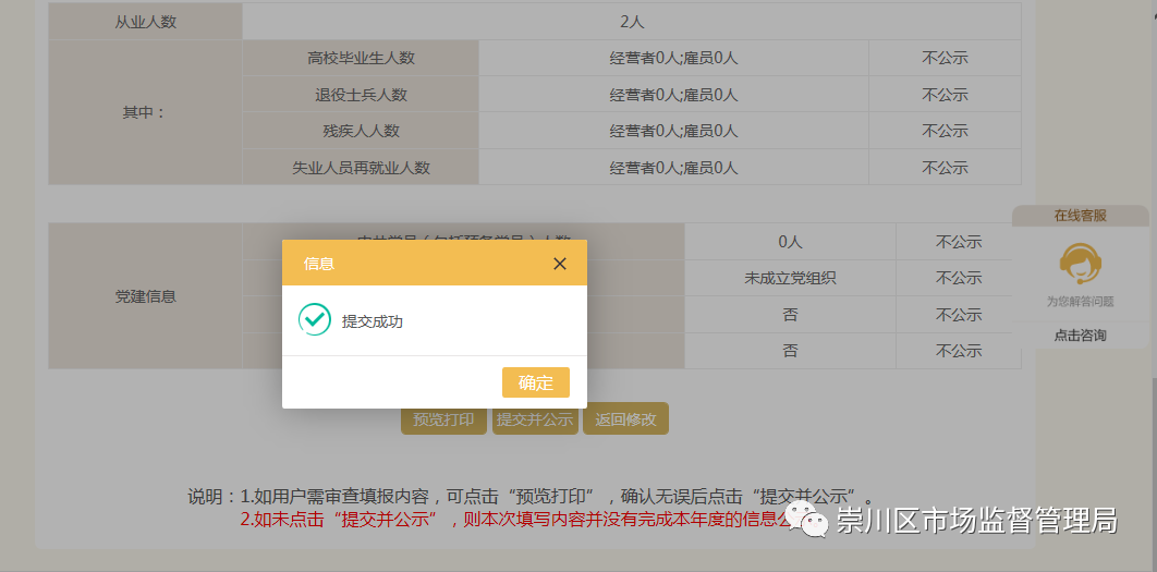注意閱讀下圖說(shuō)明,若檢查沒(méi)有問(wèn)題點(diǎn)擊“提交并公示”,出現(xiàn)“提交成功”后,點(diǎn)擊“確定”,年報(bào)完成。