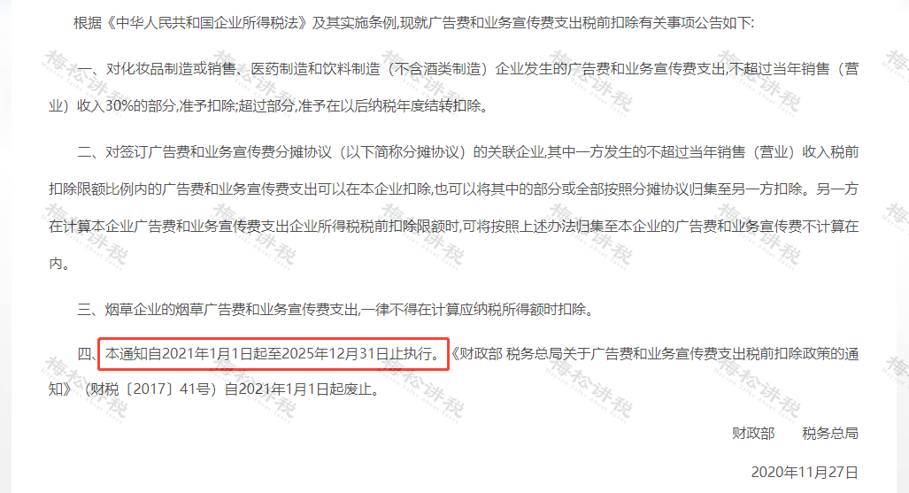 4、該政策只是對(duì)《財(cái)政部 稅務(wù)總局關(guān)于廣告費(fèi)和業(yè)務(wù)宣傳費(fèi)支出稅前扣除政策的通知》(財(cái)稅〔2017〕41號(hào))政策的延續(xù),執(zhí)行時(shí)間延長(zhǎng)至2025年12月31日。
