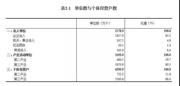 2018年末,全國(guó)共有從事第二產(chǎn)業(yè)和第三產(chǎn)業(yè)活動(dòng)的法人單位2178.9萬(wàn)個(gè),比2013年末(2013年是第三次全國(guó)經(jīng)濟(jì)普查年份,下同)增加1093.2萬(wàn)個(gè),增長(zhǎng)100.7%;產(chǎn)業(yè)活動(dòng)單位2455.0萬(wàn)個(gè),增加1151.5萬(wàn)個(gè),增長(zhǎng)88.3%;個(gè)體經(jīng)營(yíng)戶6295.9萬(wàn)個(gè)(詳見(jiàn)表2-1)。