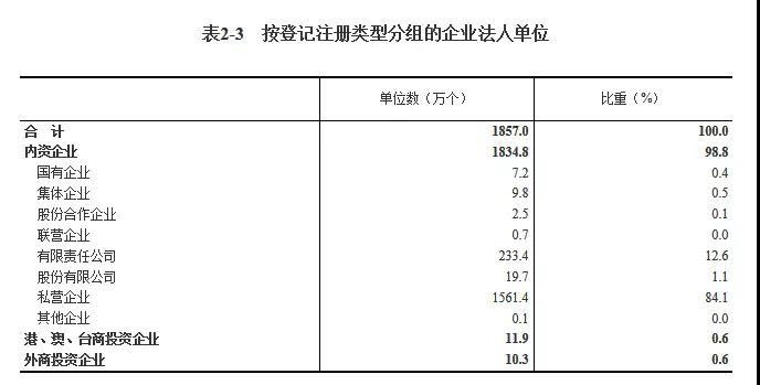 2018年末,全國(guó)共有第二產(chǎn)業(yè)和第三產(chǎn)業(yè)的企業(yè)法人單位1857.0萬(wàn)個(gè),比2013年末增加1036.2萬(wàn)個(gè),增長(zhǎng)126.2%。其中,內(nèi)資企業(yè)占98.8%,港、澳、臺(tái)商投資企業(yè)占0.6%,外商投資企業(yè)占0.6%。內(nèi)資企業(yè)中,國(guó)有企業(yè)占全部企業(yè)法人單位的0.4%,私營(yíng)企業(yè)占84.1%(詳見(jiàn)表2-3)。