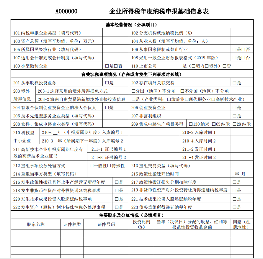 A000000《企業(yè)所得稅年度納稅申報(bào)基礎(chǔ)信息表》中:基本經(jīng)營(yíng)情況為小微企業(yè)必填項(xiàng)目,“有關(guān)涉稅事項(xiàng)情況”為選填項(xiàng)目有關(guān)涉稅事項(xiàng)情況發(fā)生時(shí)才填報(bào),主要股東及分紅情況為免填項(xiàng)目。