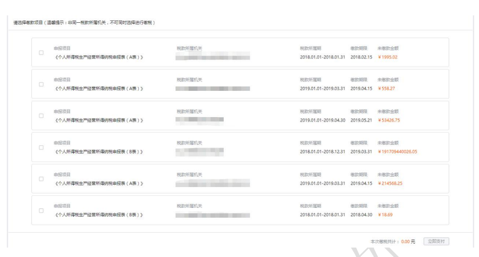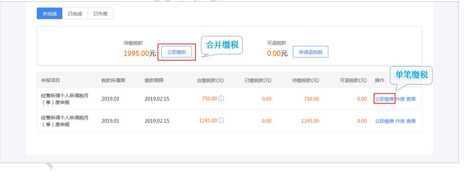 1、自然人電子稅務(wù)局網(wǎng)頁端(推薦使用) 建議納稅人通過自然人電子稅務(wù)局網(wǎng)頁端進(jìn)行繳納稅款!!!網(wǎng)址:https://etax.chinatax.gov.cn/納稅人在2021年1月完成2020年12月申報表提交后,所屬期2020年12月的稅款會與所屬期4月至11月緩繳稅款一并繳納。具體操作方法:點擊【我要查詢】-【申報查詢】-【未完成】,選擇對應(yīng)申報項目進(jìn)行繳稅,如有多條未繳款記錄可點擊【立即繳稅】(僅同一個稅款所屬機關(guān)、收款國庫的申報可合并繳稅)。