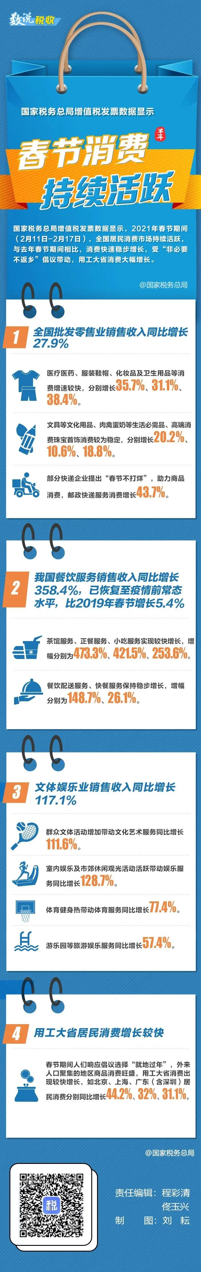 國家稅務(wù)總局增值稅發(fā)票數(shù)據(jù)顯示,2021年春節(jié)期間,全國居民消費(fèi)市場(chǎng)持續(xù)活躍,與去年春節(jié)期間相比,消費(fèi)快速穩(wěn)步增長。哪些行業(yè)增長較快?戳圖了解↓