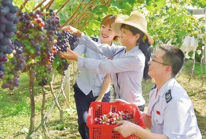 圖為國家稅務(wù)總局鳳翔縣稅務(wù)局干部來到當(dāng)?shù)剞r(nóng)業(yè)產(chǎn)業(yè)園,宣傳支持脫貧攻堅和農(nóng)業(yè)發(fā)展的稅收政策,并與果農(nóng)一起采摘葡萄,分享豐收的喜悅。