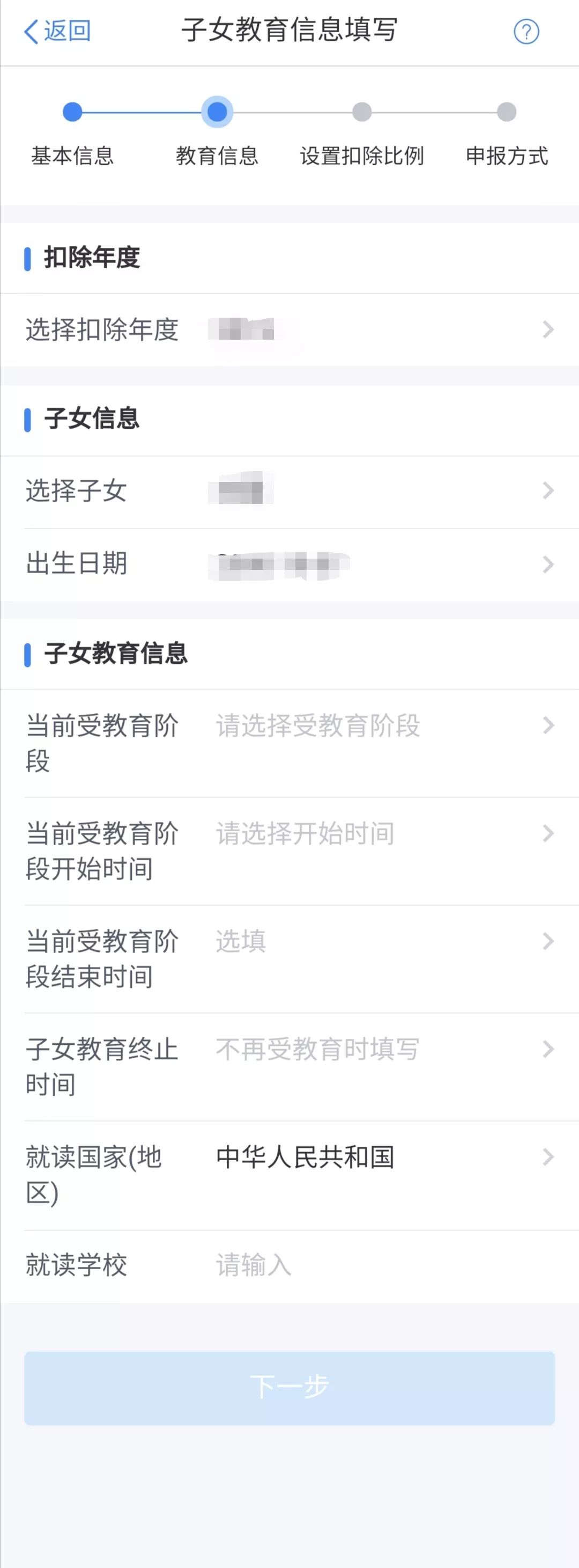 3.選擇扣除年度,填寫子女信息。(注:子女教育信息中,當(dāng)前受教育階段、當(dāng)前受教育階段開始時(shí)間、就讀學(xué)校為必填項(xiàng),子女教育終止時(shí)間只有在子女不再受教育時(shí)才需填寫。)