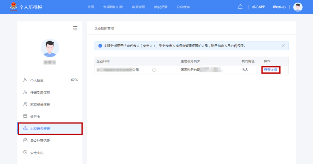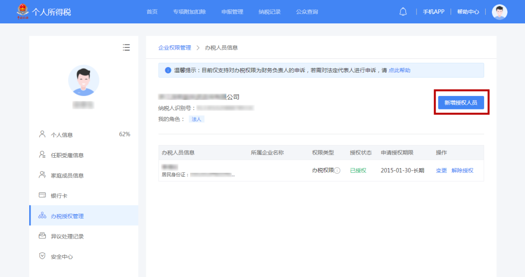 企業(yè)法人、財務(wù)負責人登錄平臺后,個人中心頁面顯示“企業(yè)辦稅權(quán)限”。“企業(yè)辦稅權(quán)限”自動展示當前任職受雇單位列表,可進行授權(quán)管理。