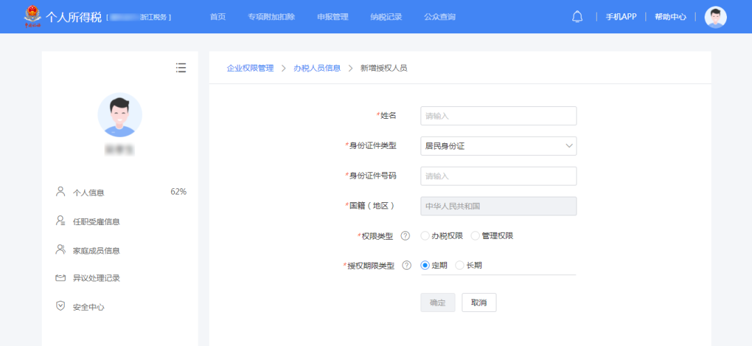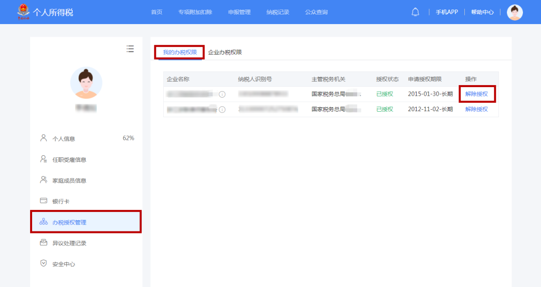 ?、诳劾U單位稅務(wù)登記的法定代表人和財務(wù)負責人登錄“個人所得稅APP”或“個人所得稅網(wǎng)站”后,進行辦稅授權(quán);