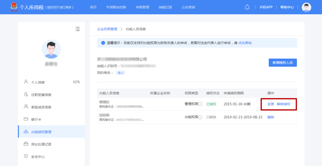 3.添加成功后,可在【辦稅人員信息】界面進行【變更】和【解除授權(quán)】,點擊【解除授權(quán)】可對該辦稅人員信息進行【刪除】。