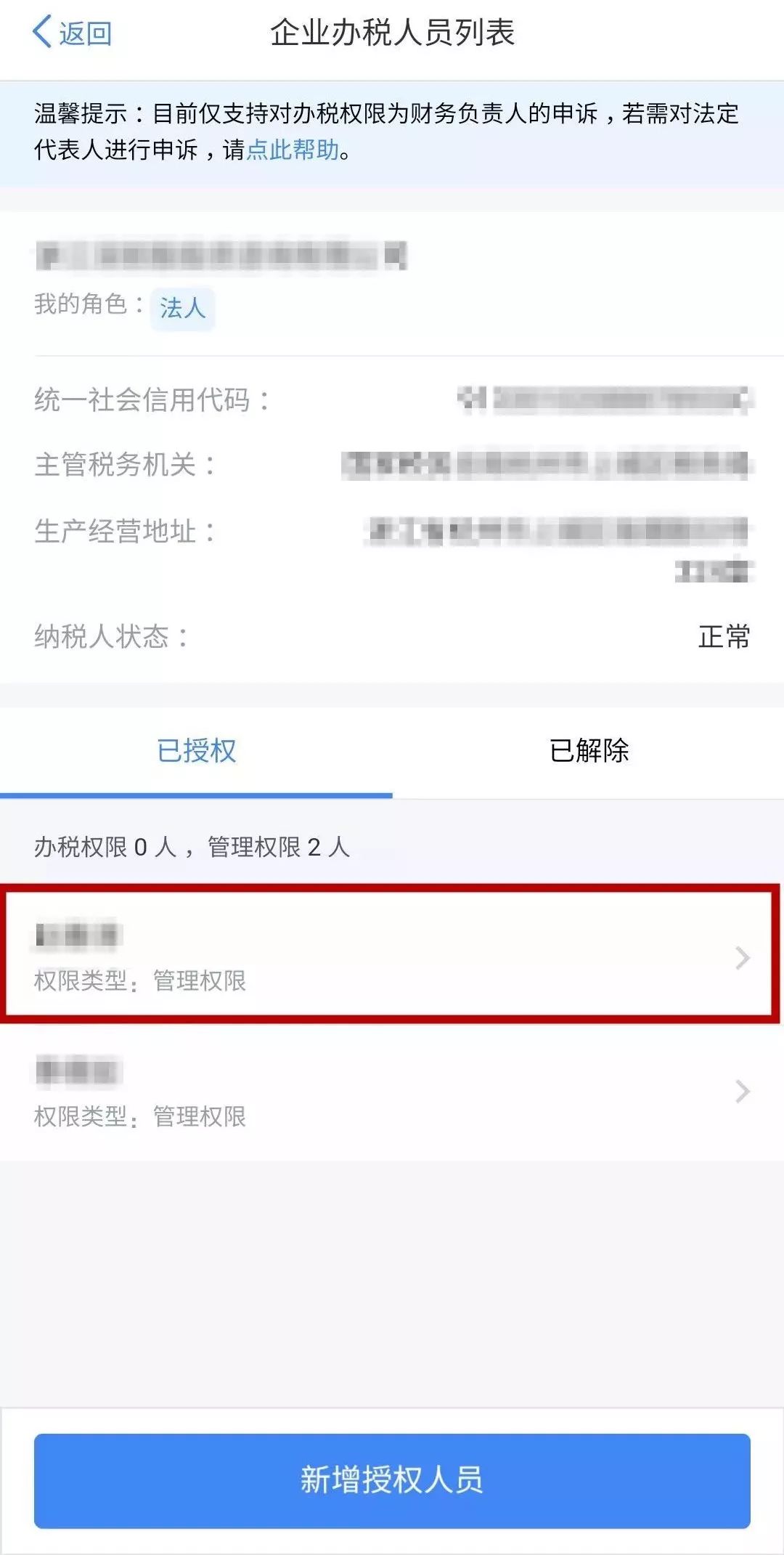 3. 添加成功后,在【企業(yè)辦稅人員列表】——【已授權(quán)】界面會顯示已添加的授權(quán)人員信息,也可在該界面點擊具體人員后對辦稅人員權(quán)限進行【變更】和【解除授權(quán)】,其中【解除授權(quán)】可對該辦稅人員信息進行【刪除】。