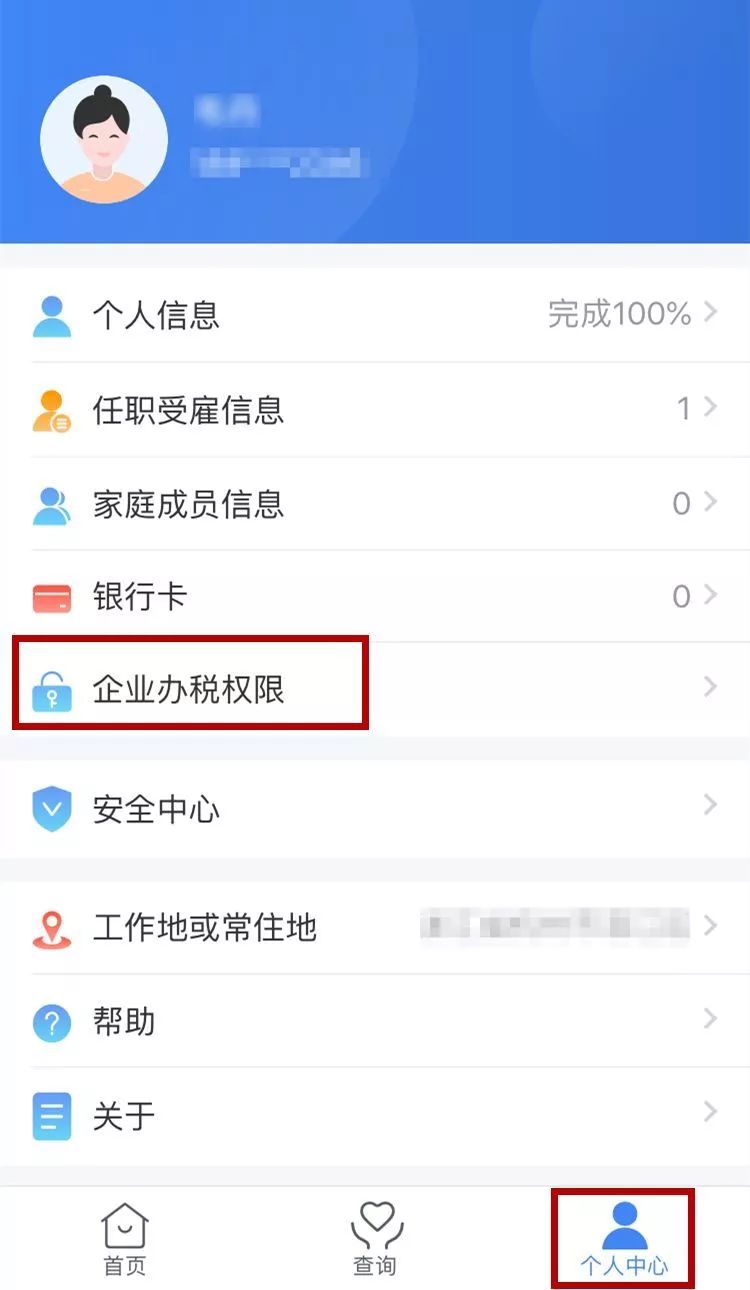 1.點擊右下方【個人中心】,再選擇【企業(yè)辦稅權(quán)限】;點擊對應(yīng)的企業(yè)名稱進入【企業(yè)辦稅人員列表】界面。