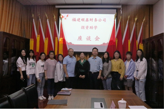 福建順鑫財務公司董事長、愛心資助活動發(fā)起人梁亞芬女士,會審系黨總支書記、主任沈永希,黨總支副書記、副主任汪建家,福建順鑫財務公司人力資源部經(jīng)理陳玲以及輔導員涂啟坪參加了座談會。
