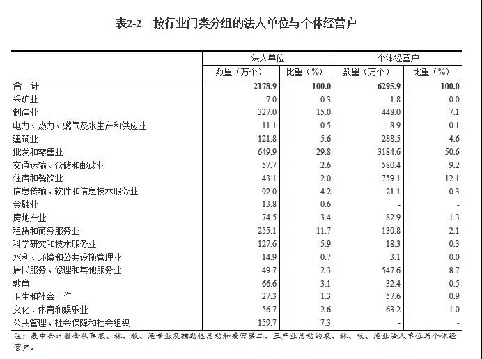 2018年末,在第二產(chǎn)業(yè)和第三產(chǎn)業(yè)法人單位中,位居前三位的行業(yè)是:批發(fā)和零售業(yè)649.9萬個,占29.8%;制造業(yè)327.0萬個,占15.0%;租賃和商務服務業(yè)255.1萬個,占11.7%。在個體經(jīng)營戶中,位居前三位的行業(yè)是:批發(fā)和零售業(yè)3184.6萬個,占50.6%;住宿和餐飲業(yè)759.1萬個,占12.1%;交通運輸、倉儲和郵政業(yè)580.4萬個,占9.2%(詳見表2-2)。