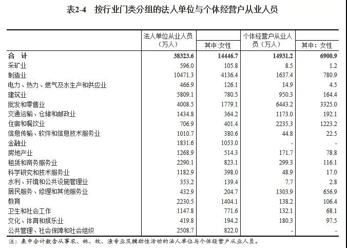 在法人單位從業(yè)人員中,位居前三位的行業(yè)是:制造業(yè)10471.3萬人,占27.3%;建筑業(yè)5809.1萬人,占15.2%;批發(fā)和零售業(yè)4008.5萬人,占10.5%。在個體經(jīng)營戶從業(yè)人員中,位居前三位的行業(yè)是:批發(fā)和零售業(yè)6443.2萬人,占43.2%;住宿和餐飲業(yè)2235.3萬人,占15.0%;制造業(yè)1637.4萬人,占11.0%(詳見表2-4)。