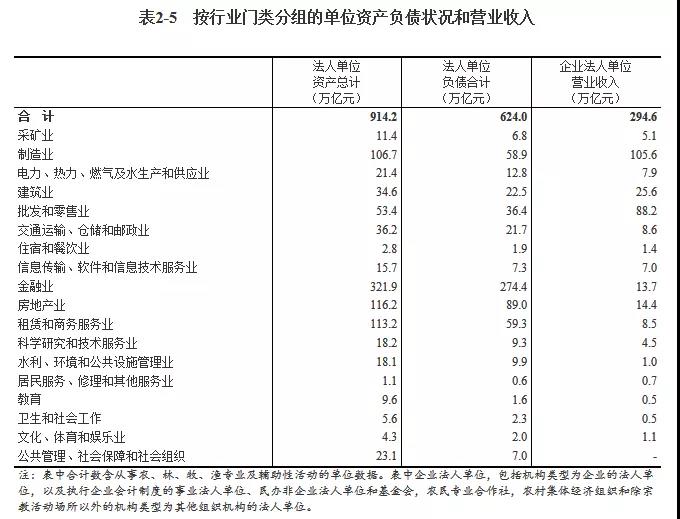 從資產(chǎn)看,2018年末,全國第二產(chǎn)業(yè)和第三產(chǎn)業(yè)法人單位資產(chǎn)914.2萬億元。從負債看,全國第二產(chǎn)業(yè)和第三產(chǎn)業(yè)法人單位負債624.0萬億元。從營業(yè)收入看,2018年,全國第二產(chǎn)業(yè)和第三產(chǎn)業(yè)企業(yè)法人單位營業(yè)收入294.6萬億元。
